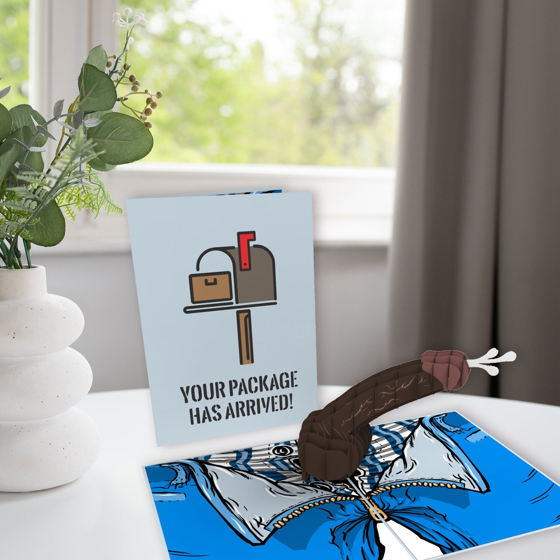 The outside of this 3D dick card is deceptively sweet, reading “Your Package Has Arrived” on the front cover. Little does that dirty dick lover know, this pop up card comes cocked and loaded with a veiny surprise. Upon opening this very adult greeting card, a slab of hefty man meat will erect itself into a rock hard statue–earning the gasp of a lifetime.