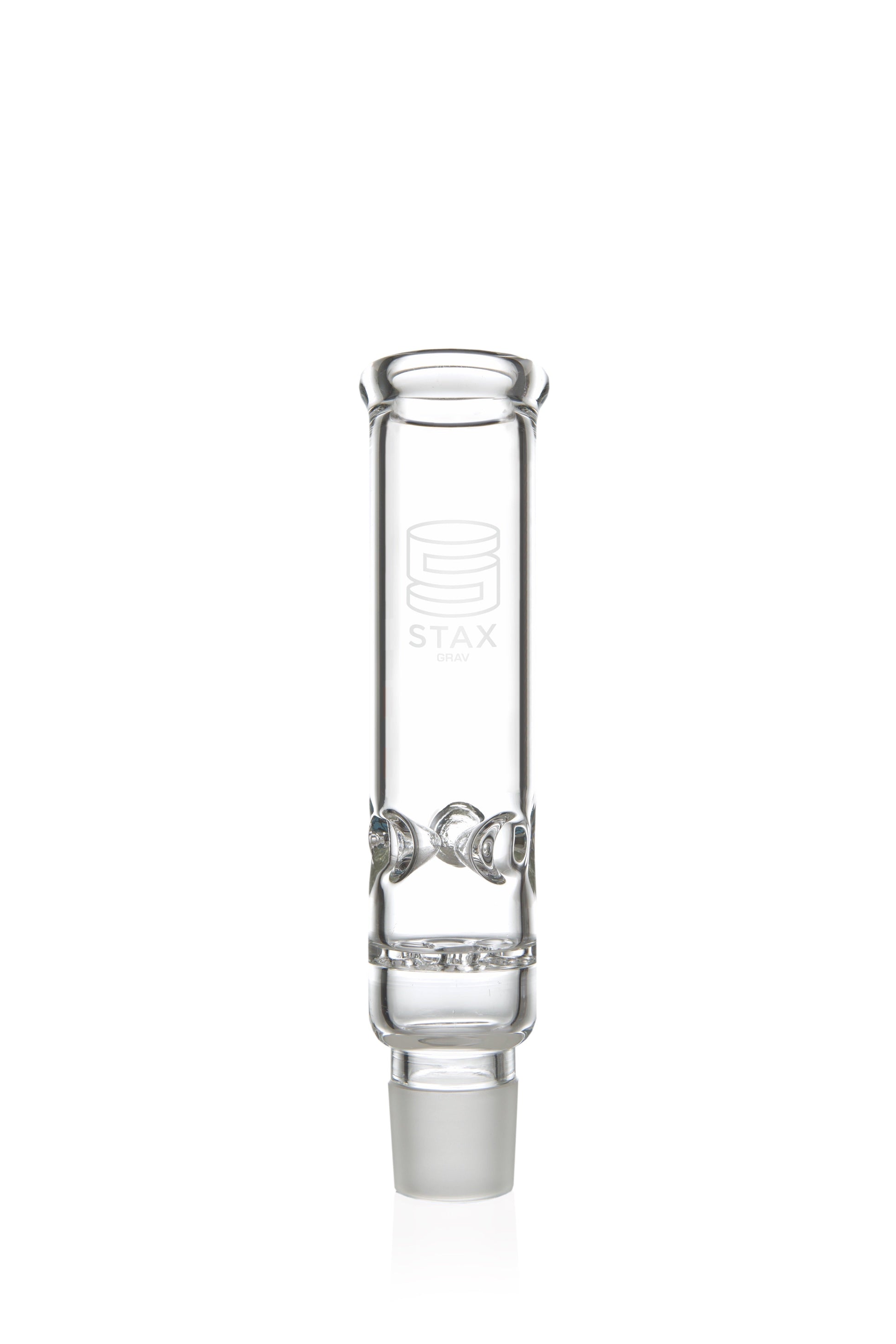 The STAX® Triple Pinch Mouthpiece is 9" tall and made on 44mm tubing. Its three glass pinches hold ice in place to cool smoke as it passes through the mouthpiece, and its 34mm joint can accommodate any STAX® percolator or base.
