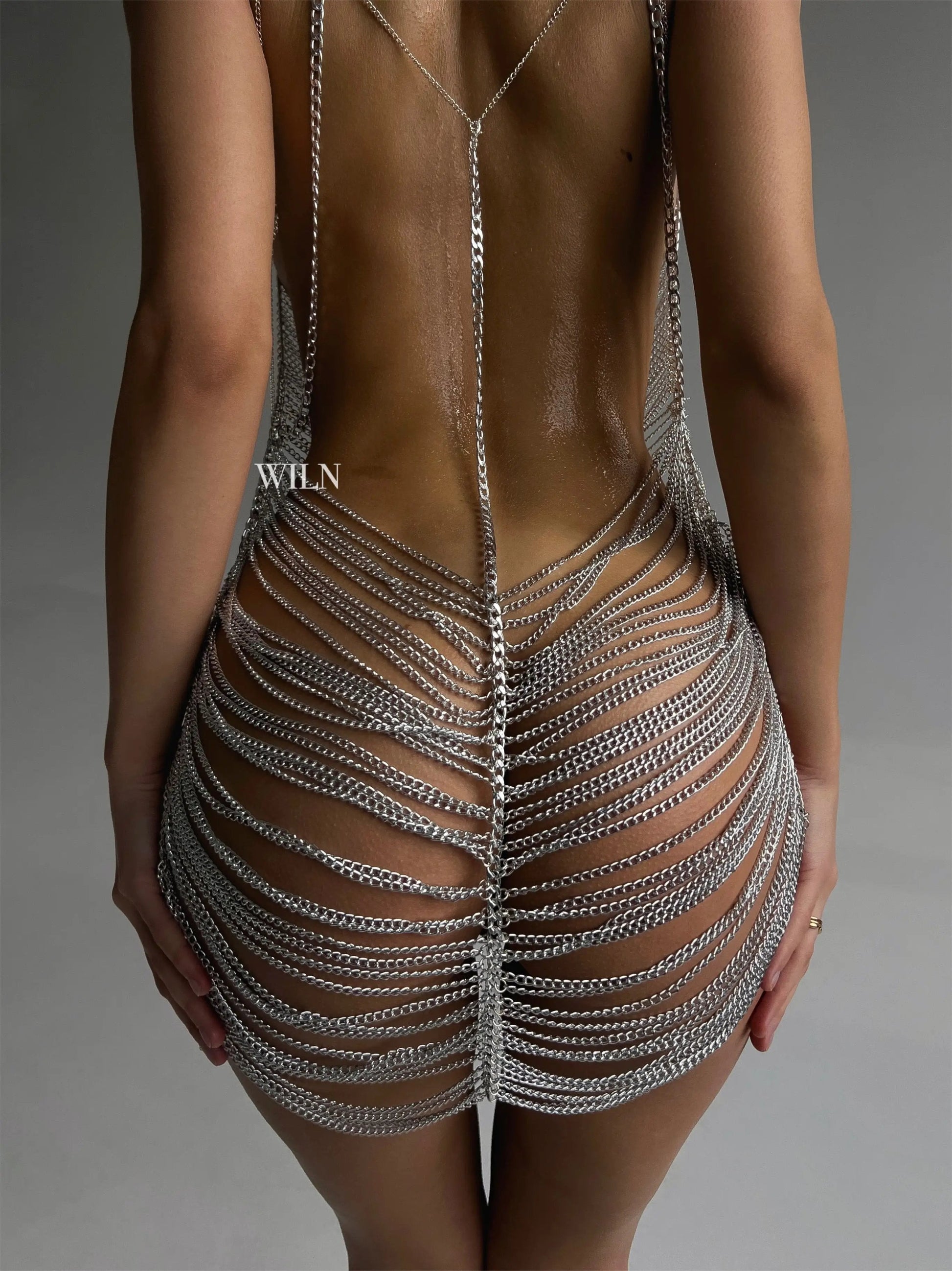 WOW.No words are needed, just set yourself free and embark on your wildest fantasies. A jaw-dropping silver or gold chains dress that will make you feel in control.