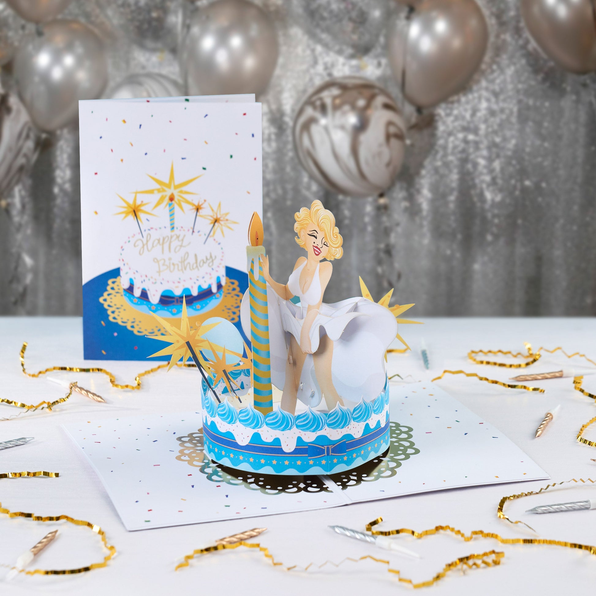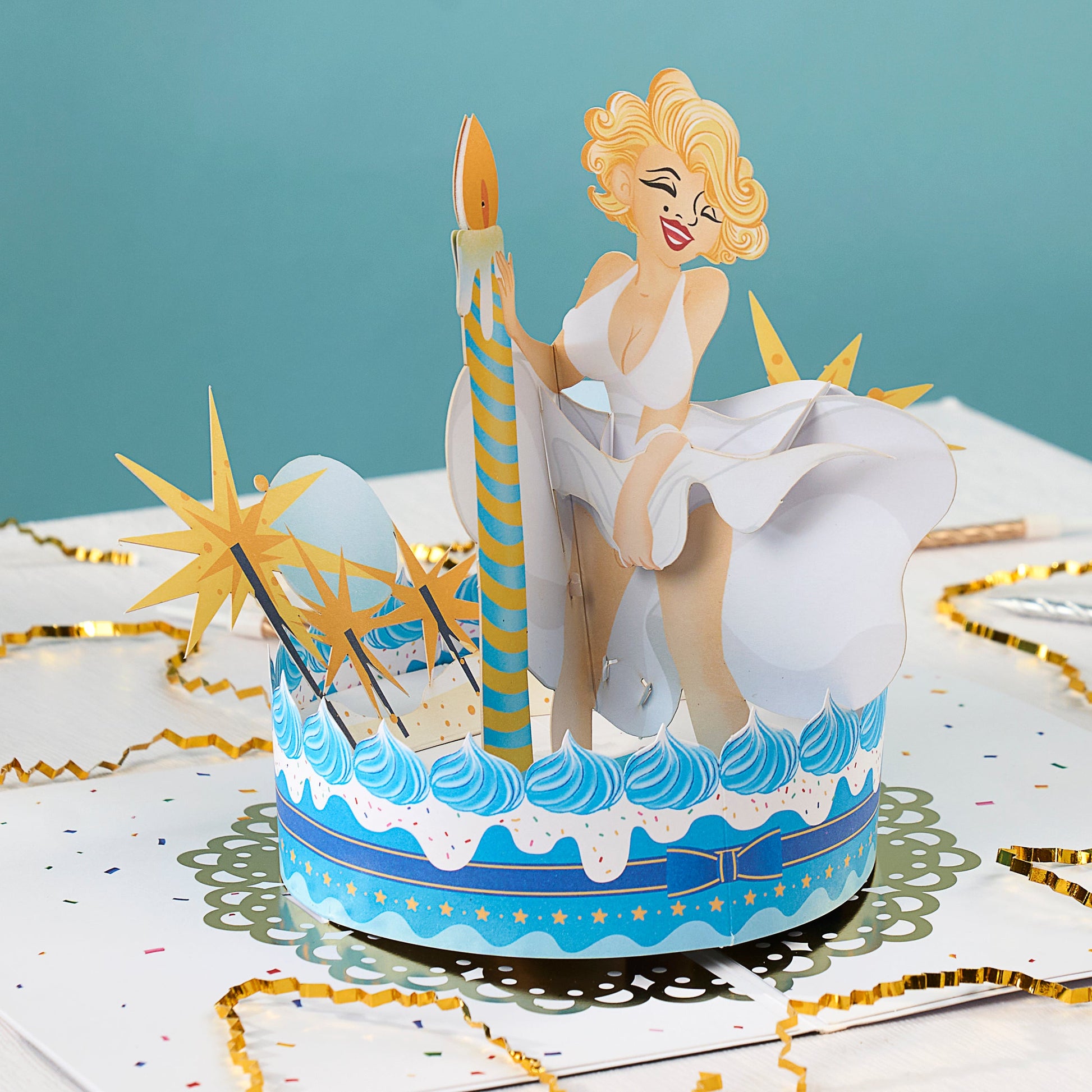 The front of the card sets the scene with an elegant birthday cake, topped with golden sparklers and a glowing candle, ready for celebration. But when the card opens, an iconic blonde bombshell makes a grand entrance, emerging from the cake in her signature pose, dress flowing as she gives a playful smile. And just as the surprise sinks in, she begins to sing a smooth and sultry rendition of “Happy Birthday to You,” making the moment unforgettable.