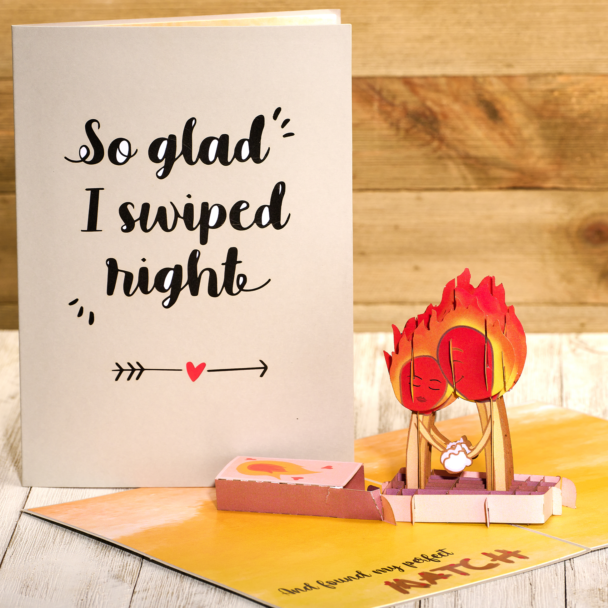 We’re the Perfect Match is a punny 3D greeting card for the lover you discovered while sitting on the toilet. The front cover features the text, “I’m so glad I swiped right,” with a little cupid’s arrow. The inside of this funny and sweet card continues, “And found my perfect match,” with a pop up matchbox with two matches holding hands—both happily sharing their flames. Get your bae-from-the-internet to awww the same way you feel every time you look at them.