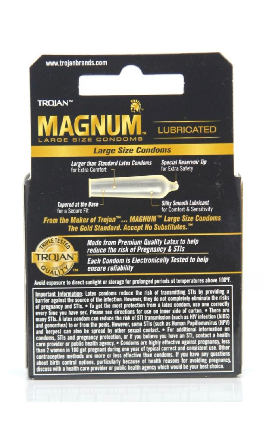 Indulge in pleasure larger than life with Magnum™ Large Size Condoms, brought to you by the creators of Trojan™ and distinguished by their unmistakable gold wrapper. Crafted for superior comfort, these condoms redefine the experience of intimacy, allowing you to savor your best moments. Go big or go home.