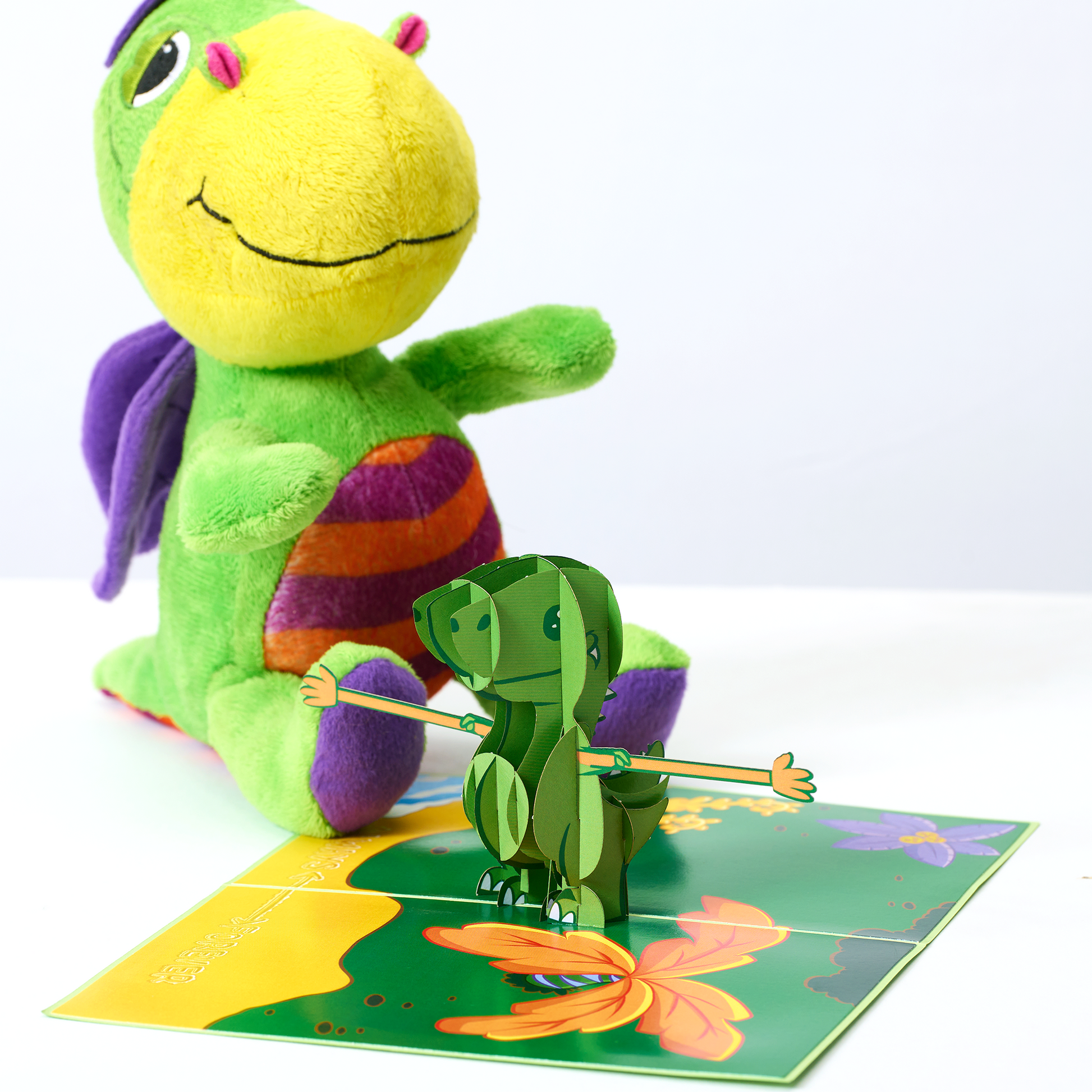 • Inside of card: Pop up T-Rex holding arm extending poles